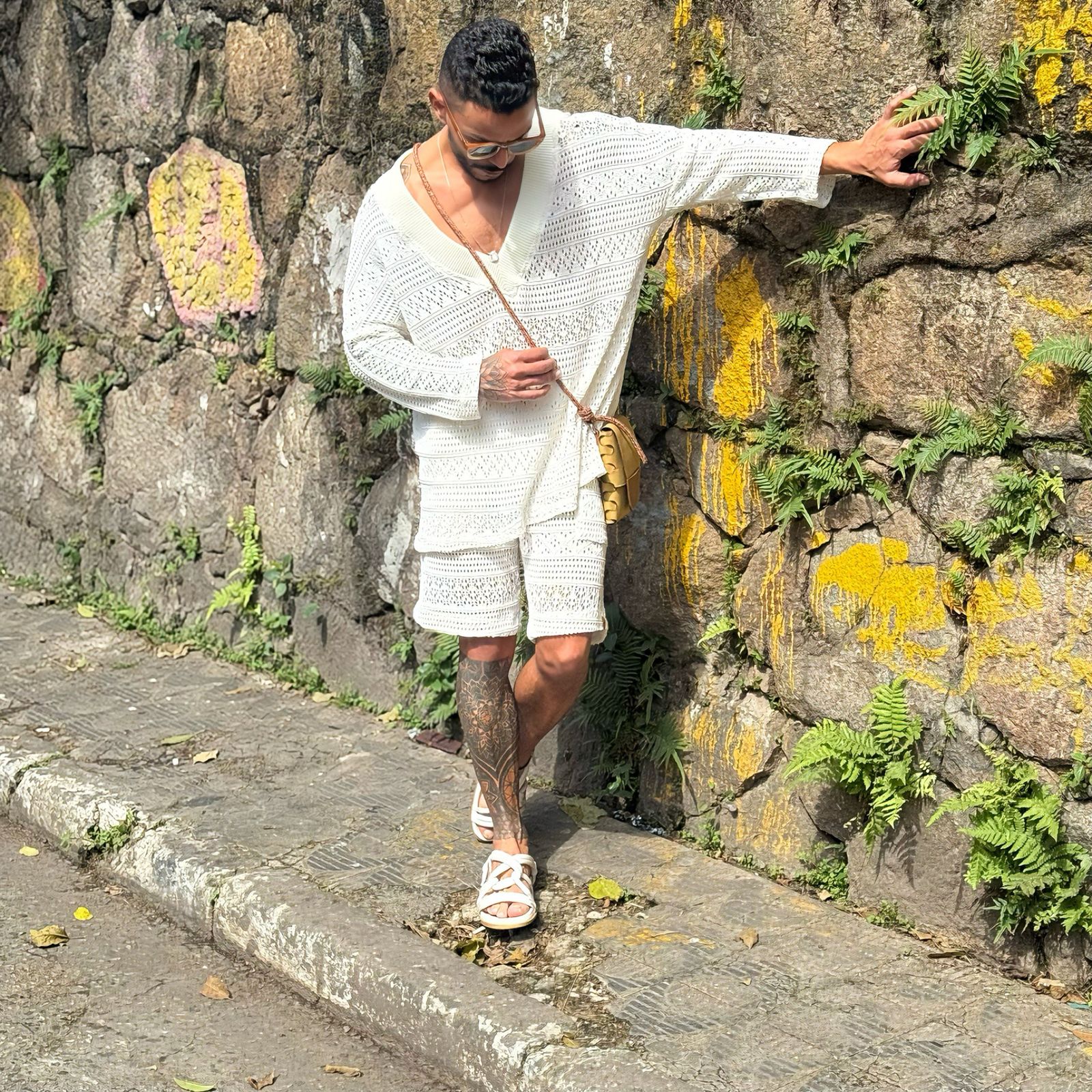 - Trama estilo vovó repaginada direto das passarelas da Fashion Week. O bermudão? Abaixo do joelho, com aquele toque “cruzeiro europeu em agosto”.
